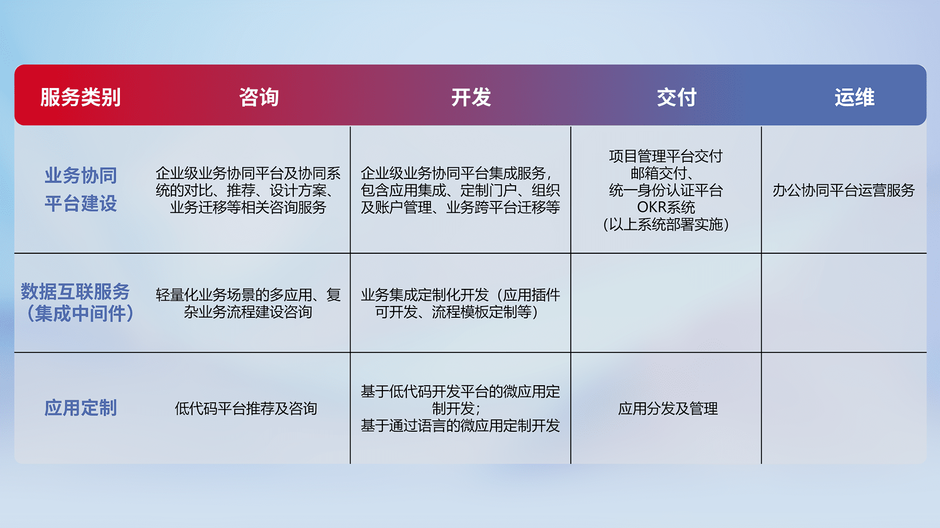 针对钉钉、、企微、、、、IDaas等平台级产品提供产品的规划、、、、方案、、、交付、、定制化开发等服务,,,,实现如统一协同办公、、、智能客户服务、、、混合会议管理、、智能数据查询、、、等业务场景,,,实现数字化转型。。。